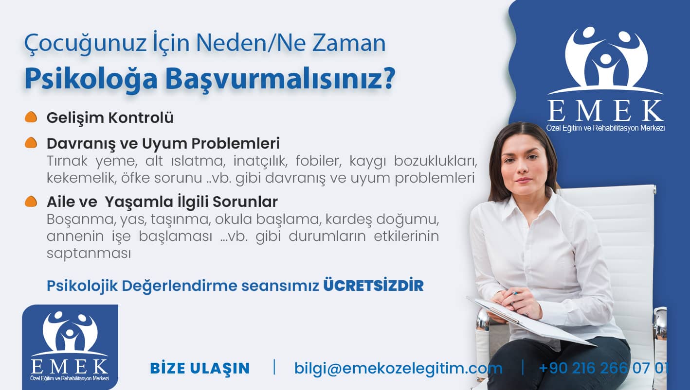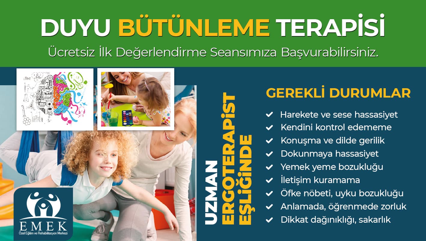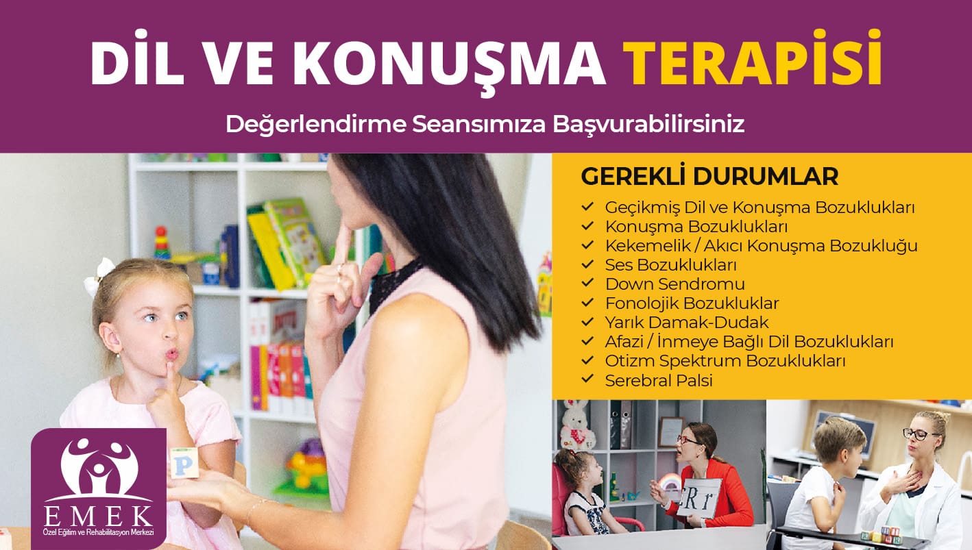 Emek Özel Eğitim ve Rehabilitasyon Merkezi olarak, 2018 yılında “Eğitim EMEK İster “ düsturunu benimseyip özel gereksinimli; Otizm Spektrum Bozukluğu (OSB), Down Sendromu, Yaygın Gelişimsel Bozukluklar, Zihinsel Yetersizlik (Mental Retardasyon), Özel Öğrenme Güçlüğü, Serebral Palsi, Asperger Sendromu, Rett Sendromu Disleksi gibi zihinsel ve bedensel engel gruplarında yer alan bireylerimize; yaş, cinsiyet, engel derecesi gözetmeksizin bireysel özellikleri